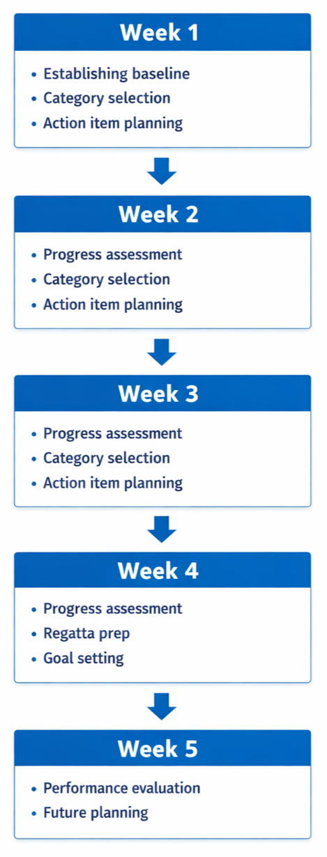 A structured, week-by-week coaching program designed to maximize your sailing performance. Each week focuses on assessment, technique, speed, and race strategy, delivering actionable tools and insights to improve your results on the water. Ideal for sailors preparing for regattas or a full season.